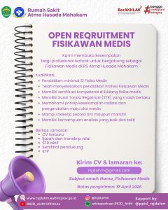 RS Atma Husada Mahakam membuka lowongan pekerjaan untuk posisi Fisikawan Medis.