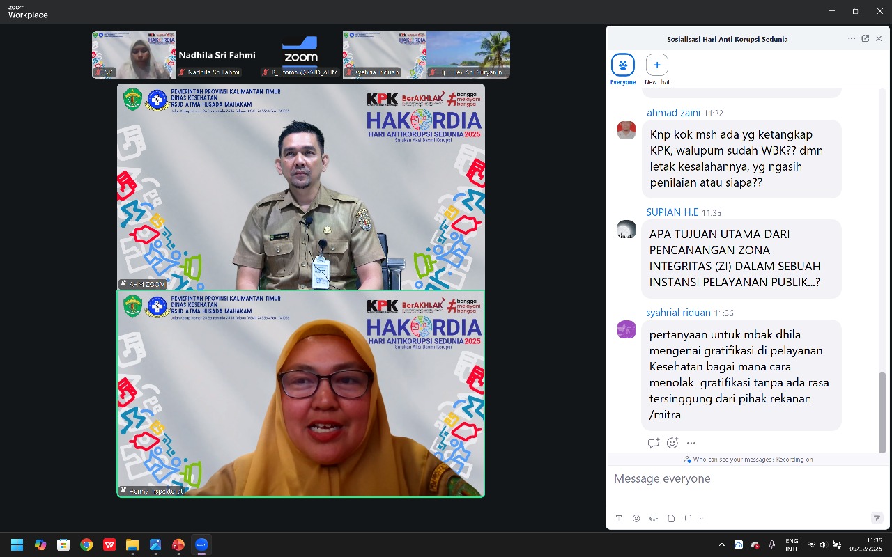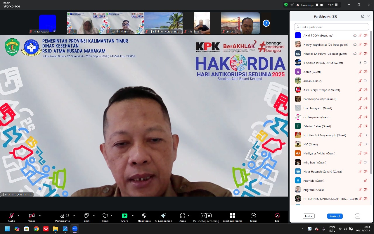 SAMARINDA – Dalam rangkaian peringatan Hari Anti Korupsi Sedunia (HAKORDIA) Tahun 2025, RSJD Atma Husada Mahakam menyelenggarakan kegiatan Sosialisasi dan Webinar Anti Korupsi. Acara ini dilaksanakan secara virtual melalui platform Zoom pada Selasa, 9 Desember 2025, dan diikuti oleh seluruh staf dan mitra rumah sakit.
